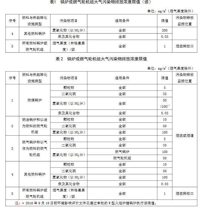 4.22016年9月20日起至本标准实施之日前环境影响评价文件通过审批的燃煤锅炉,2017年1月1日起至本标准实施之日前环境影响评价文件通过审批的燃油锅炉和以油为燃料的燃气轮机组、燃气锅炉和以气体为燃料的燃气轮机组以及其他燃料锅炉,新建锅炉或燃气轮机组,自本标准实施之日起执行表2中的排放浓度限值。