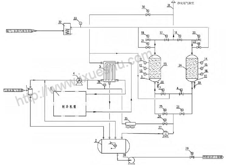 1 - 凝液收集罐; 2 - 气液分离罐; 3 - 液位变送器; 4 - 风机; 5 - 冷箱; 6 - 制冷机组; 7 - 吸附罐进口阀A; 8 - 吸附罐进口阀B; 9 - 吸附罐A; 10 - 吸附罐B; 11 - 温度变送器A; 12 - 温度变送器B; 13 - 温度变送器C; 14 - 温度变送器D; 15 - 温度变送器E; 16 - 温度变送器F; 17 - 吸附罐出口阀A; 18- 吸附罐出口阀B; 19 - 吸附罐破真空阀A; 20 - 吸附罐破真空阀B; 21 - 吹扫气进口阀A; 22 - 吹扫气进口阀B; 23 - 吸附剂床层A; 24 - 吸附剂床层B; 25 - 真空脱附阀A; 26 - 真空脱附阀B; 27 - 真空泵; 28 - 回液泵; 29 - 外输液流量开关阀; 30 - 紧急放空阀; 31 - 排放筒; 32 - 加热器; 33 - 热气体温度变送器; 34 - 热气体脱附开关阀; 35 - 冷却器、36 - 冷却温度变送器