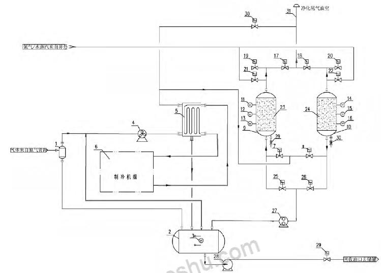 1 - 凝液收集罐; 2 - 气液分离罐; 3 - 液位变送器; 4 - 风机; 5 - 冷箱; 6 - 制冷机组; 7 - 吸附罐进口阀A; 8 - 吸附罐进口阀B; 9 - 吸附罐A; 10 - 吸附罐B; 11 - 温度变送器A; 12 - 温度变送器B; 13 - 温度变送器C; 14 - 温度变送器D; 15 - 温度变送器E; 16 - 温度变送器F; 17 - 吸附罐出口阀A; 18- 吸附罐出口阀B; 19 - 吸附罐破真空阀A; 20 - 吸附罐破真空阀B; 21 - 吹扫气进口阀A; 22 - 吹扫气进口阀B; 23 - 吸附剂床层A; 24 - 吸附剂床层B; 25 - 真空脱附阀A; 26 - 真空脱附阀B; 27 - 真空泵; 28 - 回液泵; 29 - 外输液流量开关阀;30 - 紧急放空阀; 31 - 排放筒