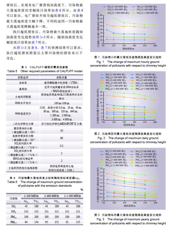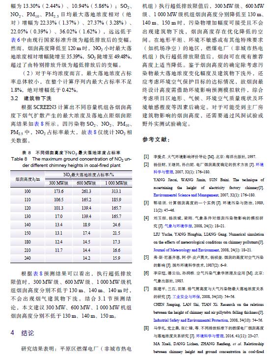 摘 要:燃煤电厂全面实施超低排放后,烟气污染物排放水平大幅降低,是否仍需采用高烟囱排放已引起关注。以平原区不同容量燃煤电厂为例,对超低排放水平下烟囱高度与污染物最大落地浓度关系进行研究,并对特定高度下是否出现建筑物下洗进行判定,分析烟囱高度优化的可能性。研究结果表明:平原区燃煤电厂执行超低排放限值后,300 MW、600 MW、1 000 MW级机组烟囱从现有推荐高度分别降低至130 m、140 m、150 m时,污染物最大落地浓度增幅不显著,初步判定污染物增加幅度可接受且不会出现建筑物下洗,烟囱高度存在优化降低的空间。